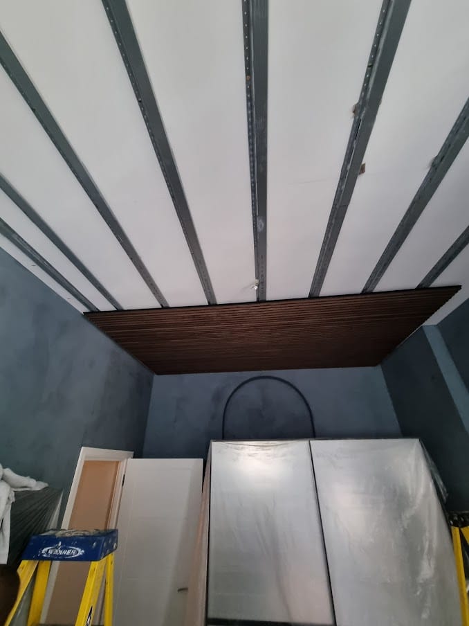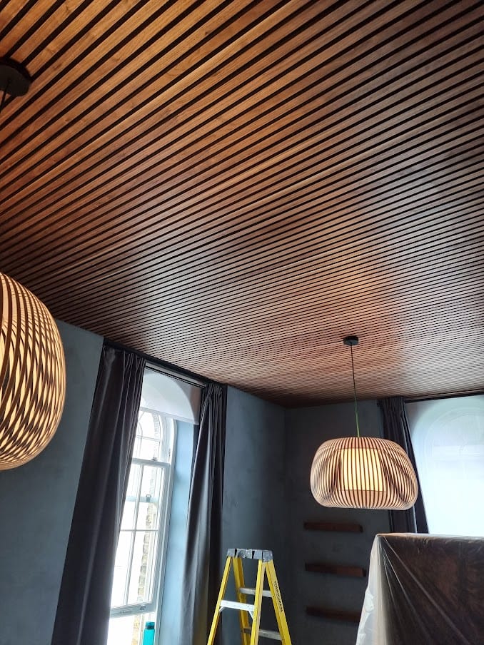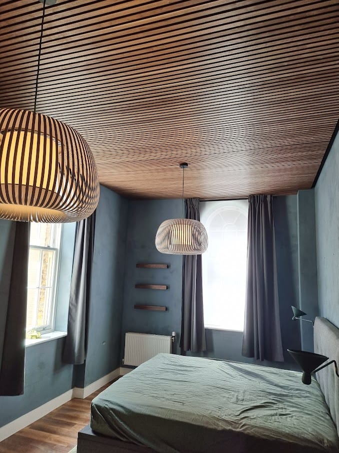 Our client contacted us to install some stylish timber acoustic panels on to his bedroom ceiling to reduce disruption caused by the underground train line near the property. We installed these onto Resilient Bars to further decouple the ceiling.